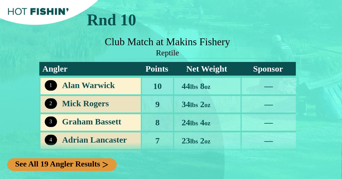 Hot Fishin' Points is a competition where the results of any match you fish receives points depending on where you rank. Prizes are won for the most points accumulated, from your best 10 matches, over the 13-week season.