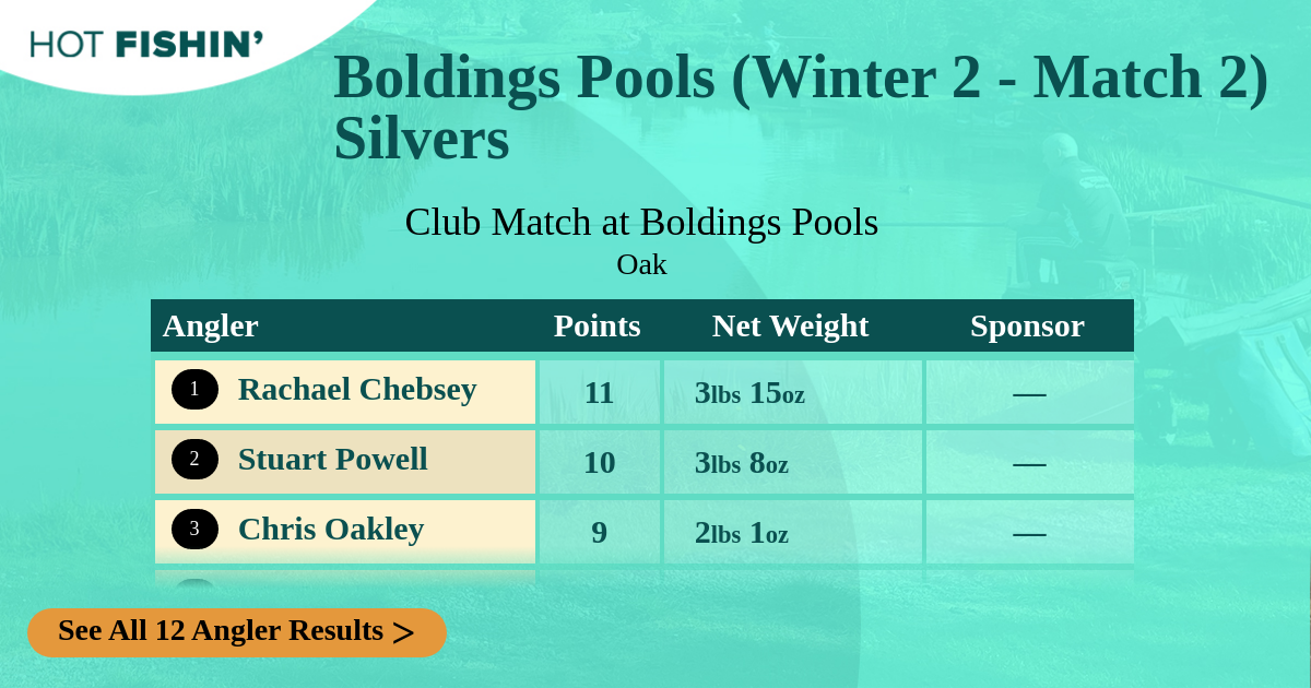 | Angler | Points | Net Weight | Section | Peg | Attendance | Sponsor |