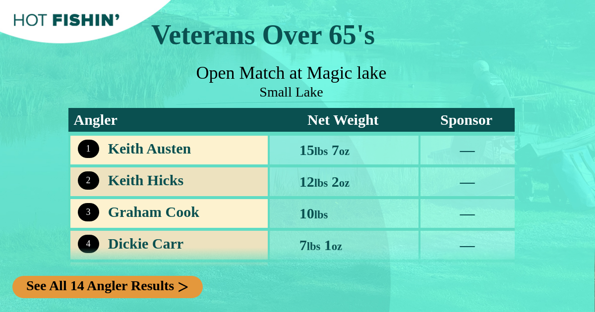 Hot Fishin' Points is a competition where the results of any match you fish receives points depending on where you rank. Prizes are won for the most points accumulated, from your best 10 matches, over the 13-week season.