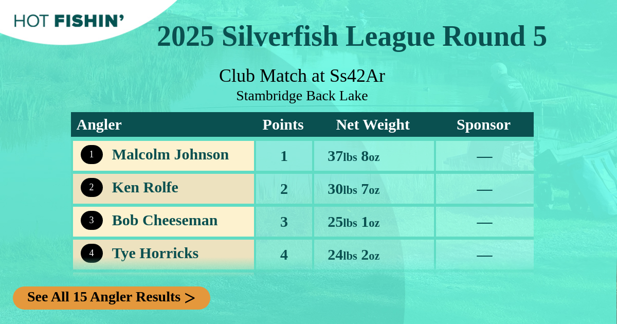 4 Malcolm Graham HydeFIDUW | 12 | 6.974kg15lbs 6oz | 1 | Full Day | — |