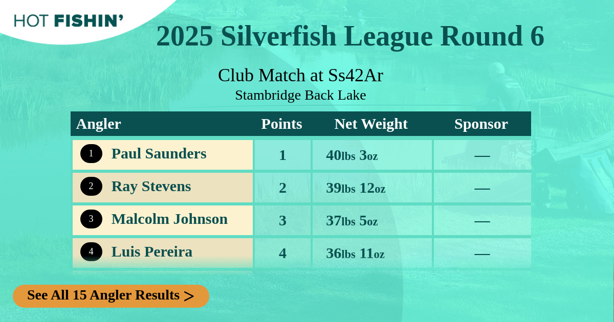| Angler | Points | Net Weight | Section | Peg | Attendance | Sponsor |