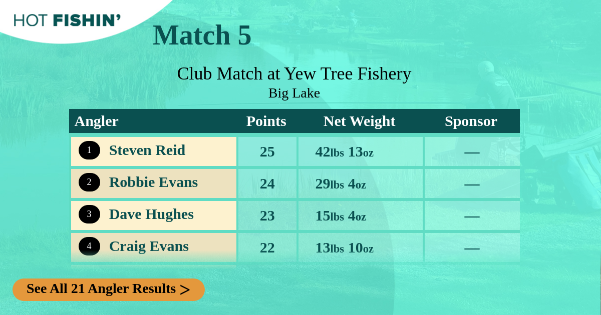 5 Gary JonesHAGGC | 21 | 6.01kg13lbs 4oz | 12 | Full Day | — |