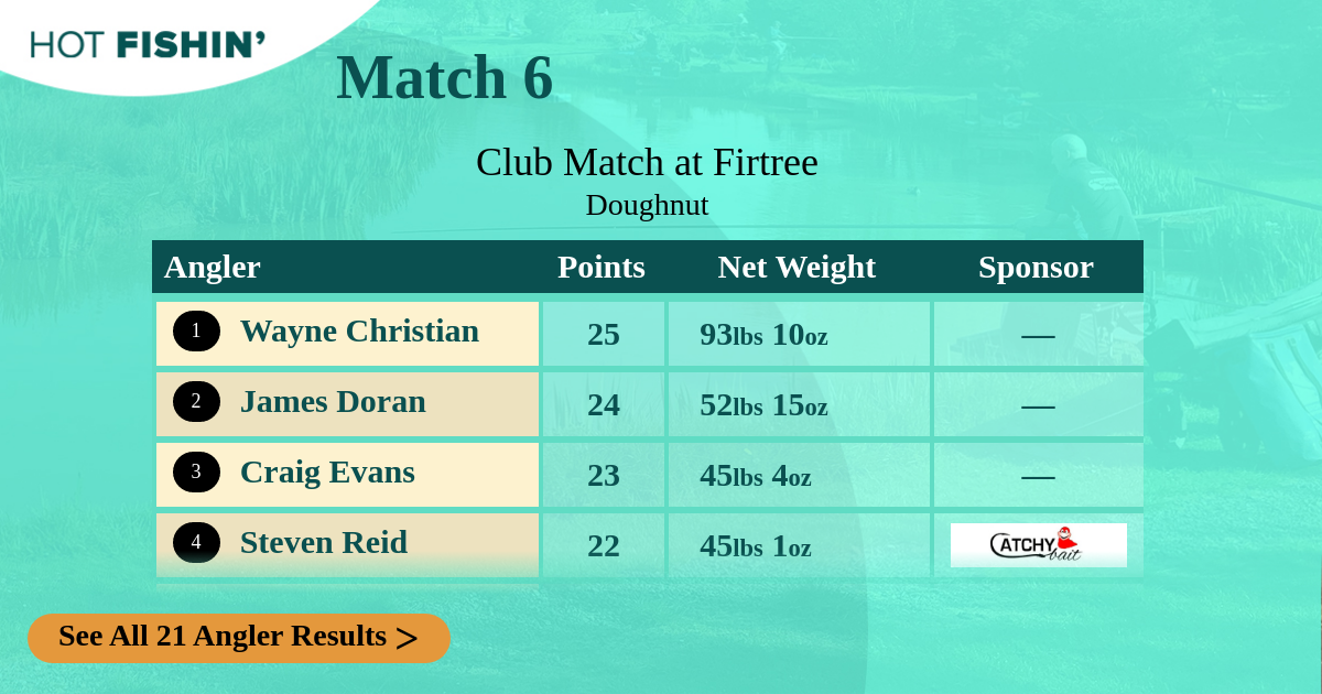 Hot Fishin' Points is a competition where the results of any match you fish receives points depending on where you rank. Prizes are won for the most points accumulated, from your best 10 matches, over the 13-week season.