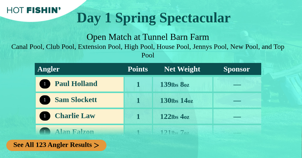 17 Craig Partridge9LJTM | 1 | 30.703kg67lbs 11oz | High Pool | H | 23 | Full Day | — |