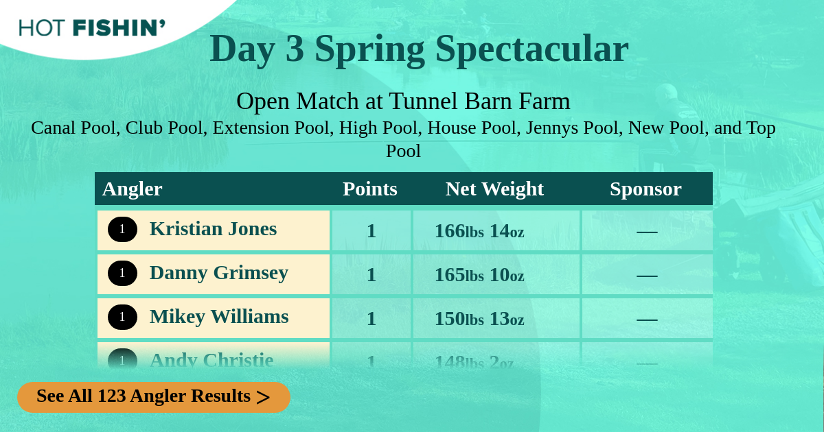 Hot Fishin' Points  is a competition where the results of any match you fish receives points depending on where you rank. Prizes are won for the most points accumulated, from your best 10 matches, over the 13-week season.