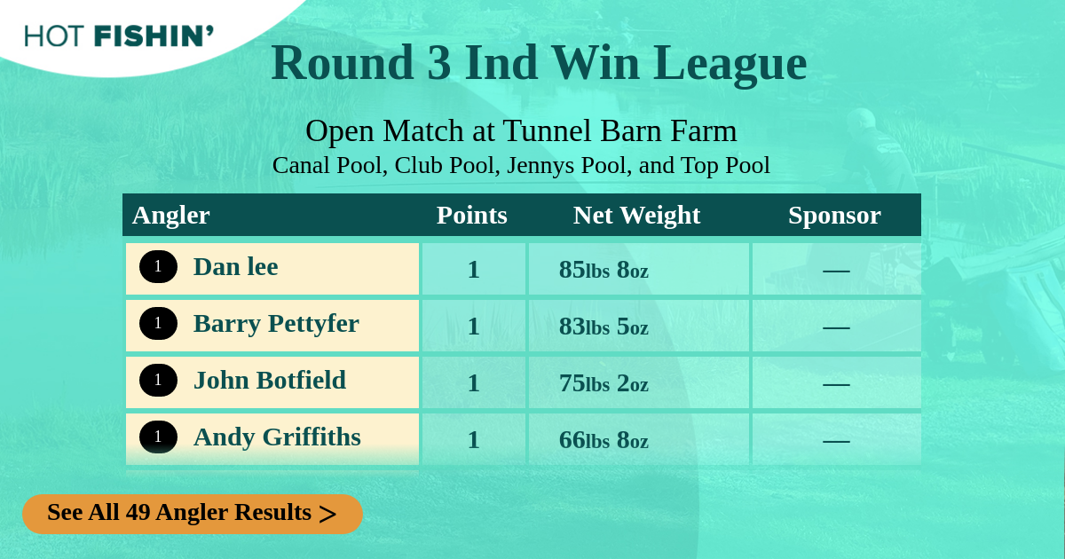 3 Paul Yeoman8NOPJ | 3 | 13.693kg30lbs 3oz | Jennys Pool | 26 | Full Day | — |
