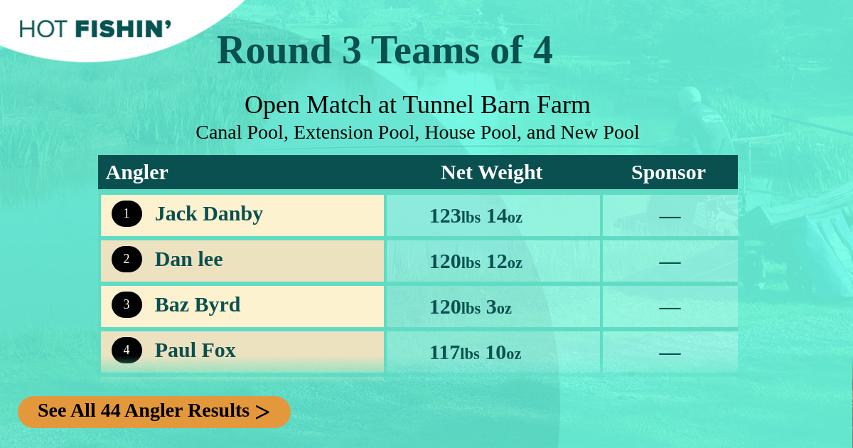 | Angler | Net Weight | Water | Section | Peg | Sponsor | |