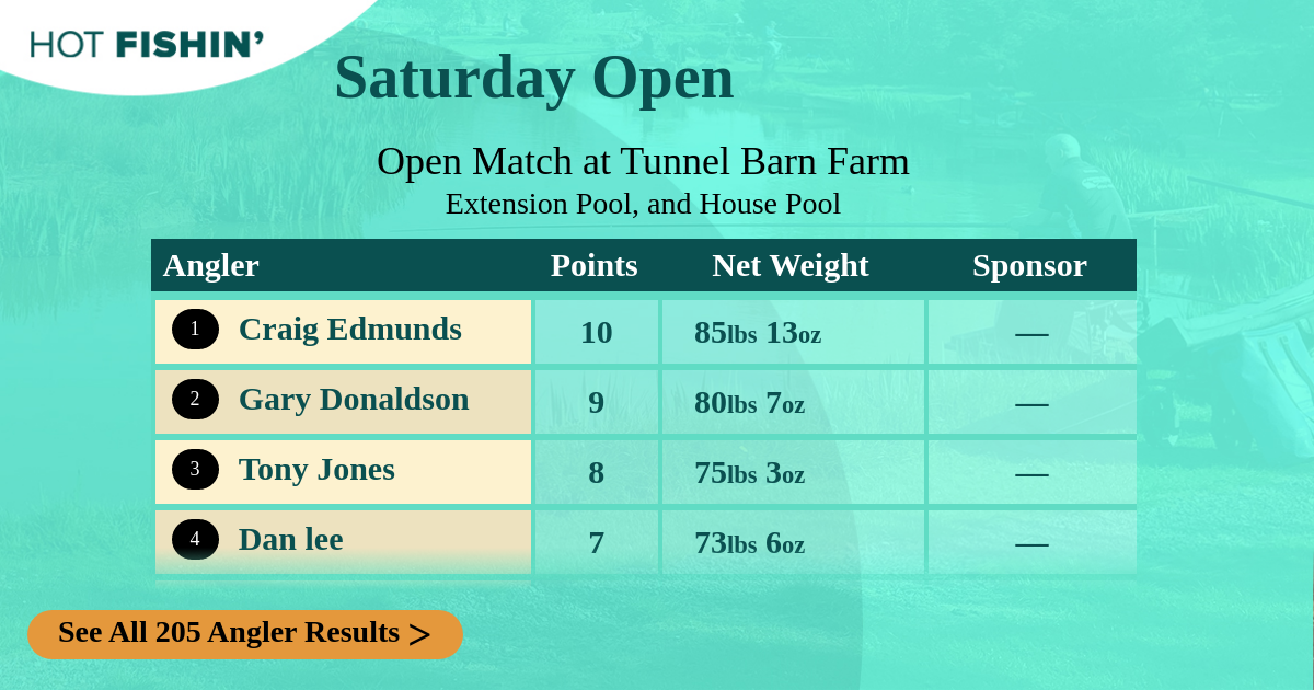 22 Paul swancottHTCHZ | 0 | 13.211kg29lbs 2oz | House Pool | D | 12 | Full Day | — |