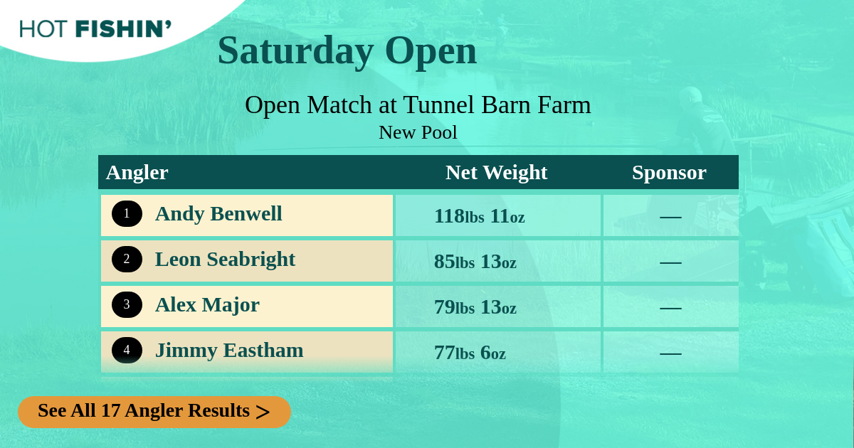 | Angler | Net Weight | Section | Peg | Sponsor | |