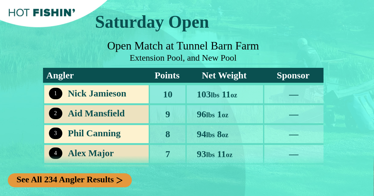 | Angler | Points | Net Weight | Water | Section | Peg | Attendance | Sponsor |