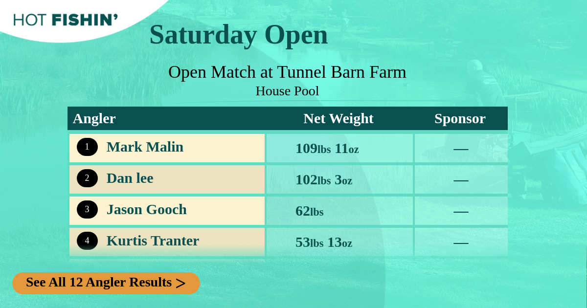| Angler | Net Weight | Section | Peg | Sponsor | |