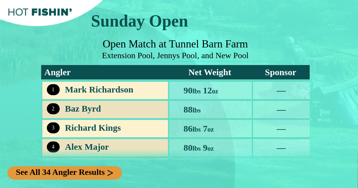 | Angler | Net Weight | Water | Section | Peg | Sponsor | |