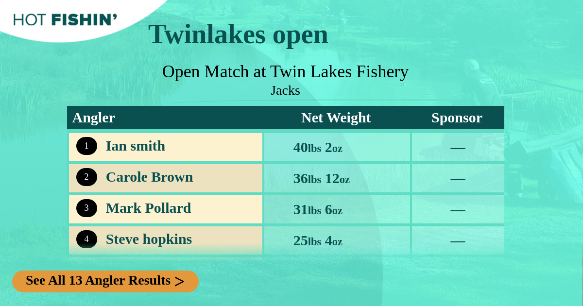| Angler | Net Weight | Section | Peg | Sponsor | |
