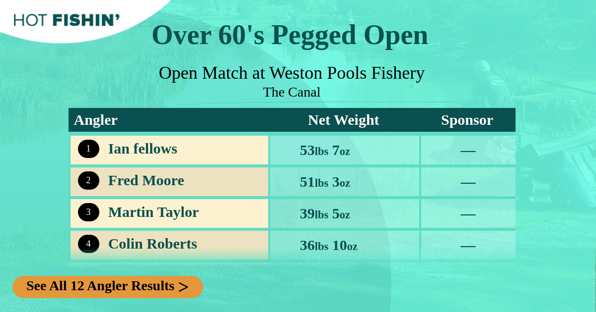 Hot Fishin' Points is a competition where the results of any match you fish receives points depending on where you rank. Prizes are won for the most points accumulated, from your best 10 matches, over the 13-week season.