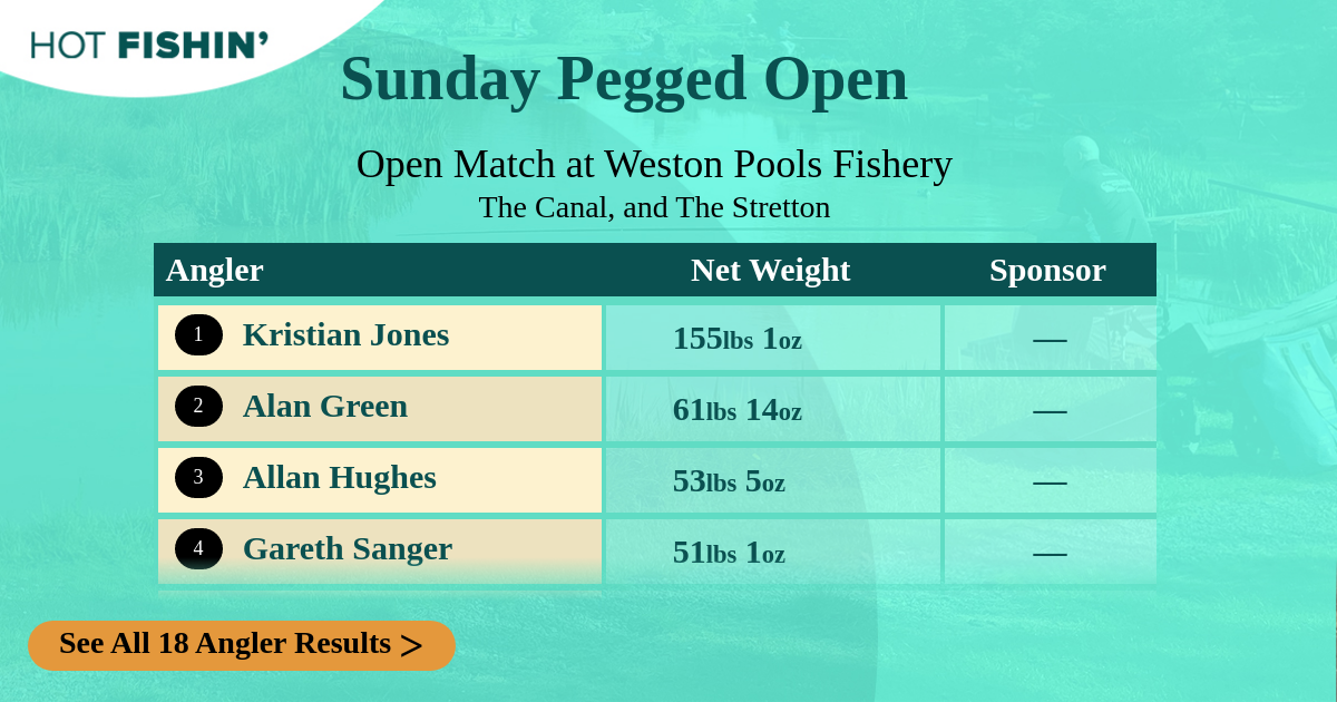 | Angler | Net Weight | Water | Peg | Sponsor | |