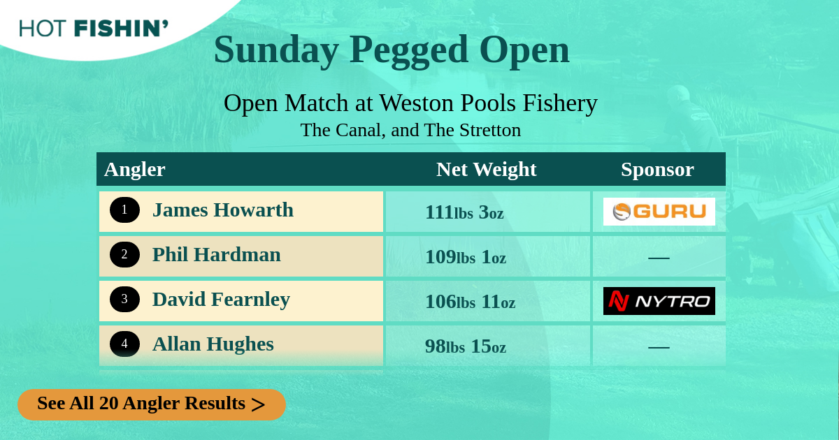 | Angler | Net Weight | Water | Peg | Sponsor | |