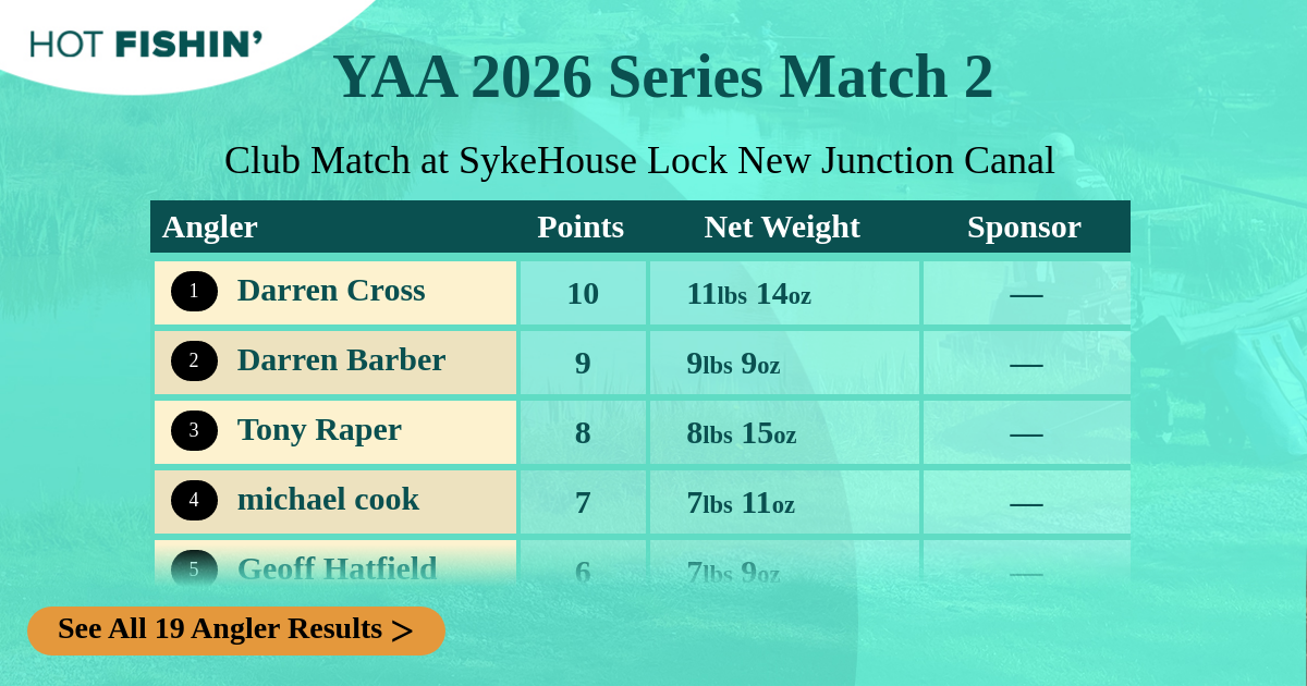 1 Darren CrossIXGZK | 10 | 5.386kg11lbs 14oz | 13 | Full Day | — |