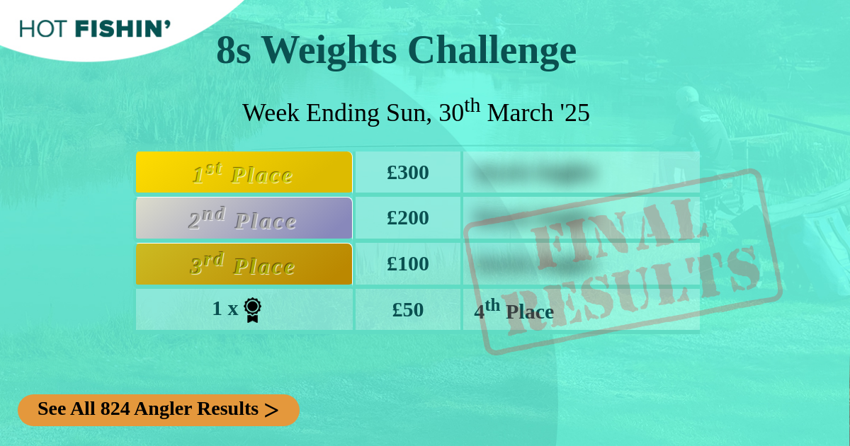 80 Ryan LidgardAP7O2 | 14th Place | 117½ % | 28.945kg63lbs 13oz | Messingham Sands Fishery | 26/03/2025 | Wednesday Open | Open Match | Coarse | 5hrs | 17 | Messingham Sands Fishery | Hollywood Strip (Johnson’s Fishery) | Commercial Water | — | 17 | — |